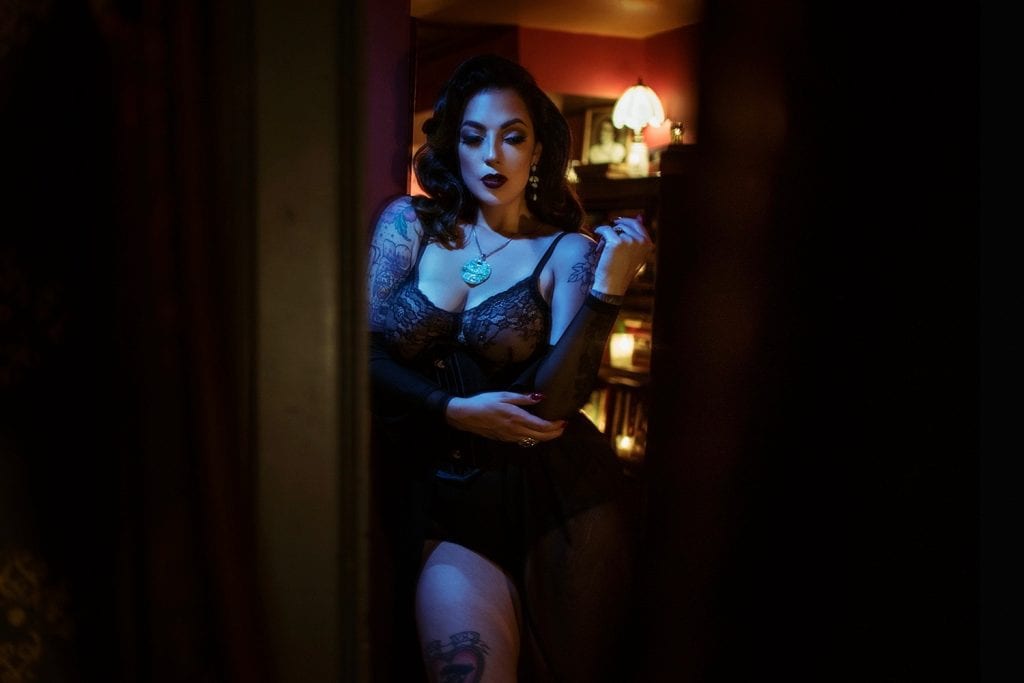 Uses a vintage, retro, or 40’s/50’s style of makeup, clothing, posing, set, props, and processing. The lighting can be very simple, often one large light source will work just fine. This allows the photographer and model to focus more attention on posing and composition. For my Pin-up sessions, I love using an available light source, which I learned originally from one of my favorite photographers, Lars Kommienezuspadt. These sessions are the most tiring in terms of work that the client and I will be doing. It’s a lot of posing and holding poses and feeling those thighs burn, but the end result is always worth it.